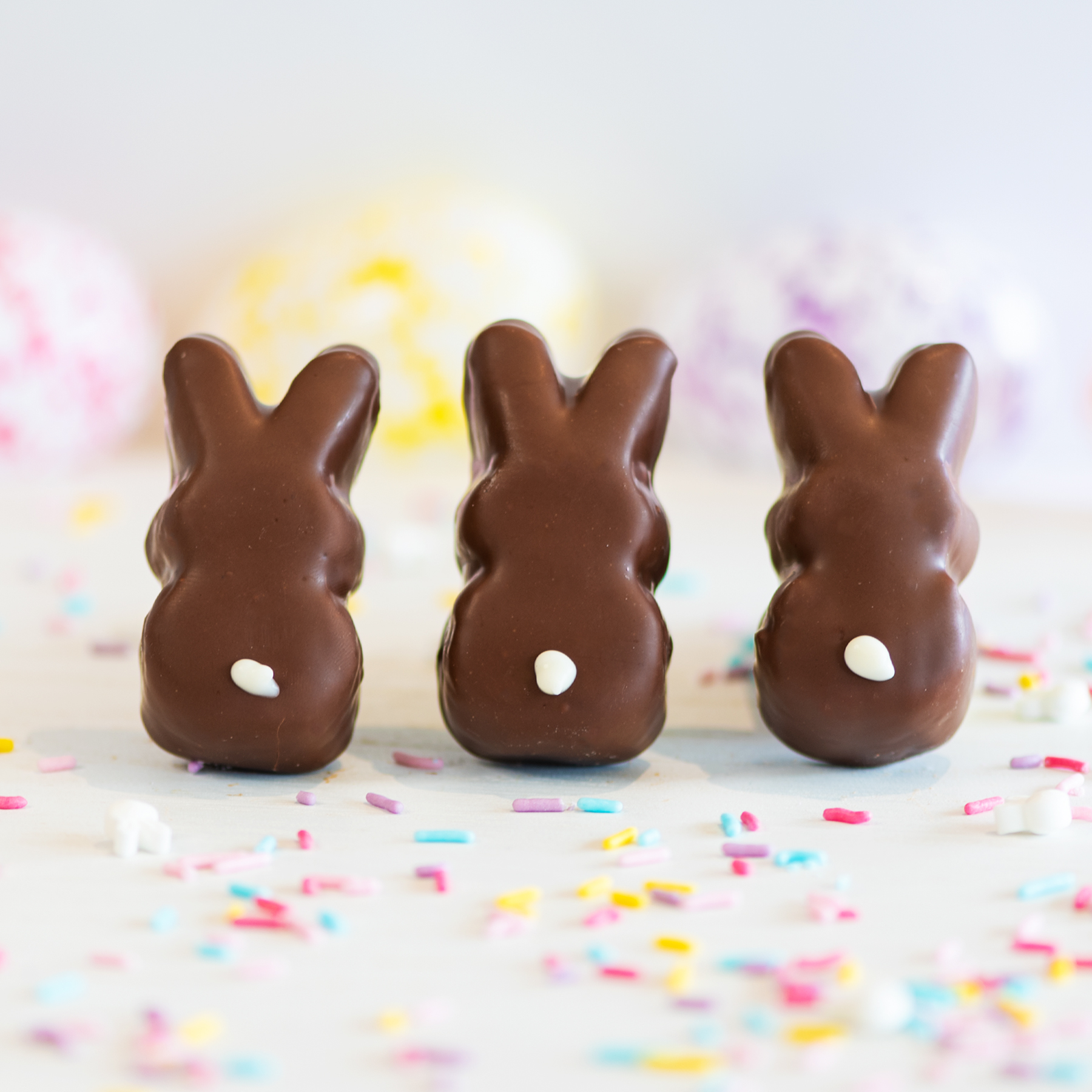 Pack of three (3) Marshmallow Peeps dipped in chocolate.