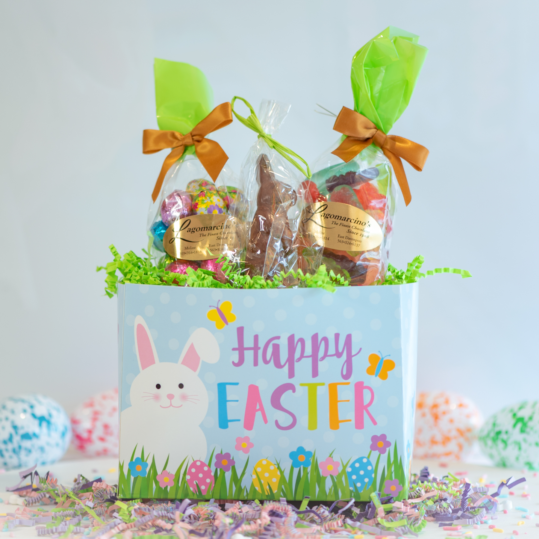 This Easter basket includes: a 4 inch Solid Chocolate Bunny, 1/2lb of Easter Gummies, 1/2 lb. of Easter Milk Chocolate Foil wrapped chocolates, and three Chocolate Covered Oreos.